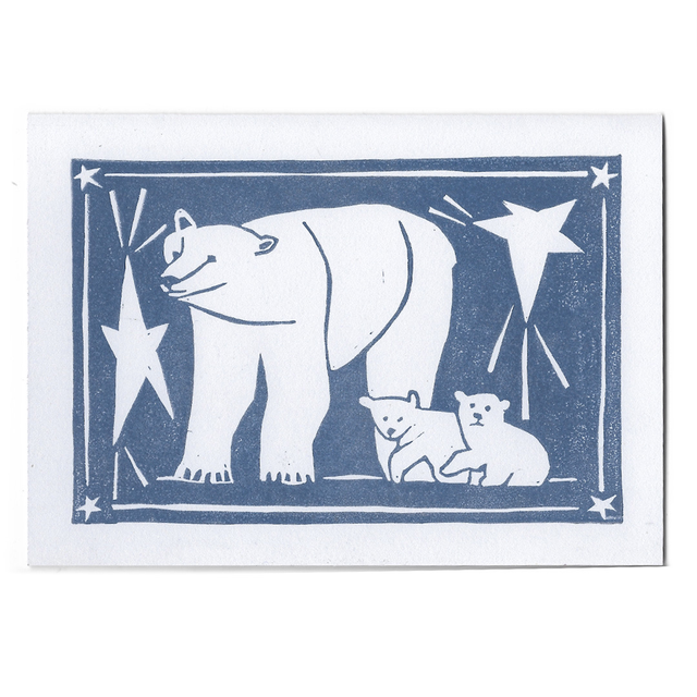Lino-printed seasonal greetings card featuring a polar bear and two cubs. Available in red ink on cream card or blue ink on off-white card (15x10.5cm).